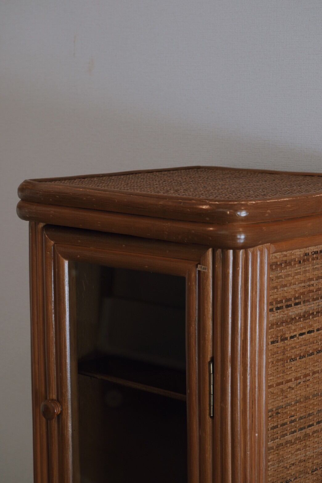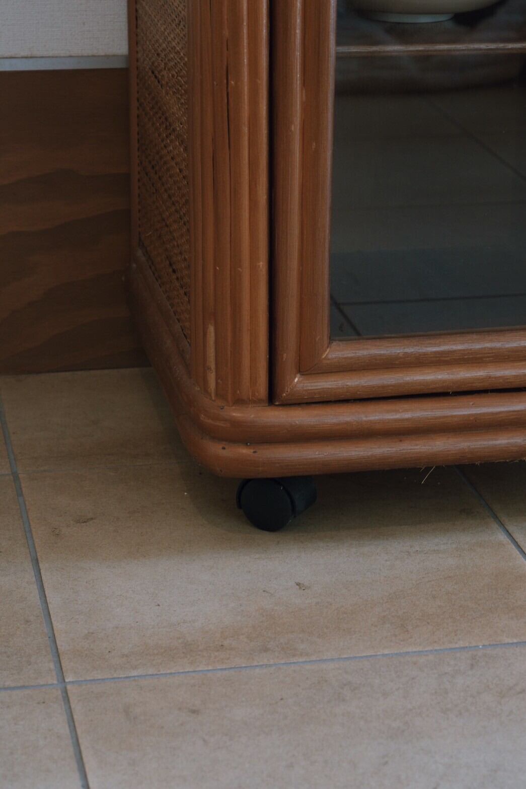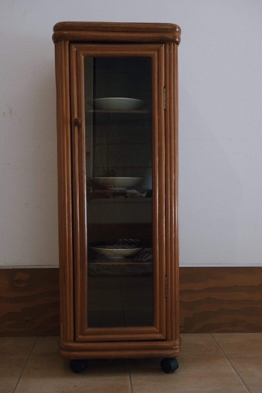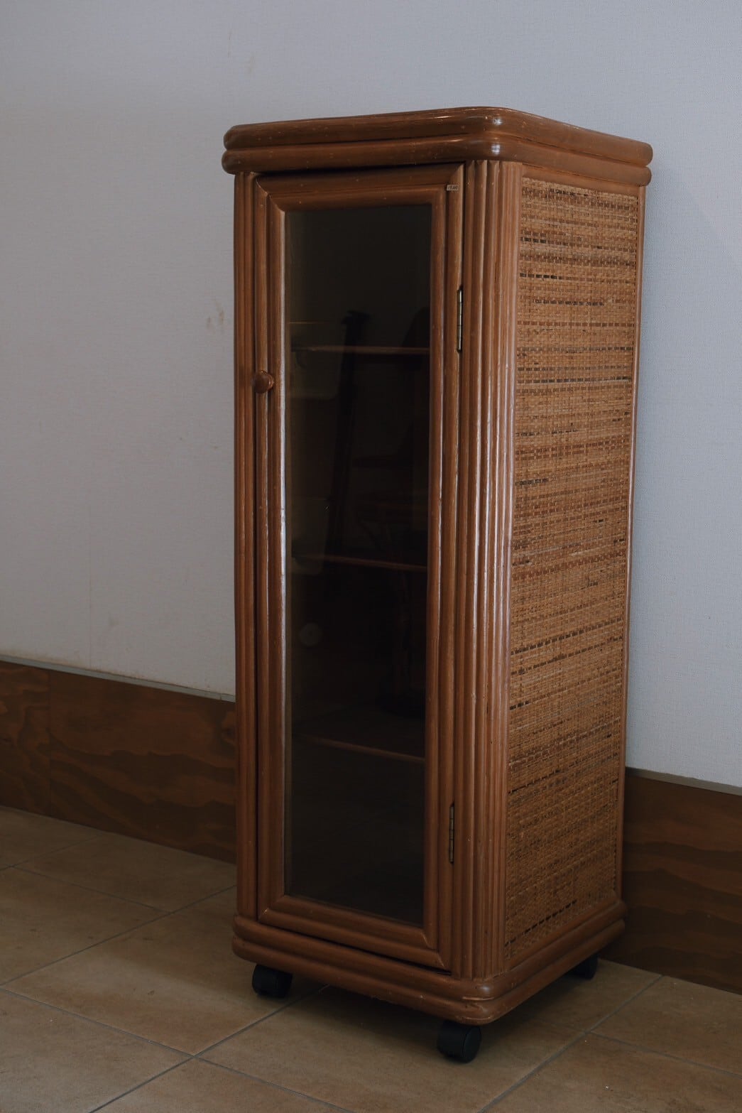 キャスター付きで動かしやすく、かっこよくもあるガラス戸のラタン収納棚が入荷!