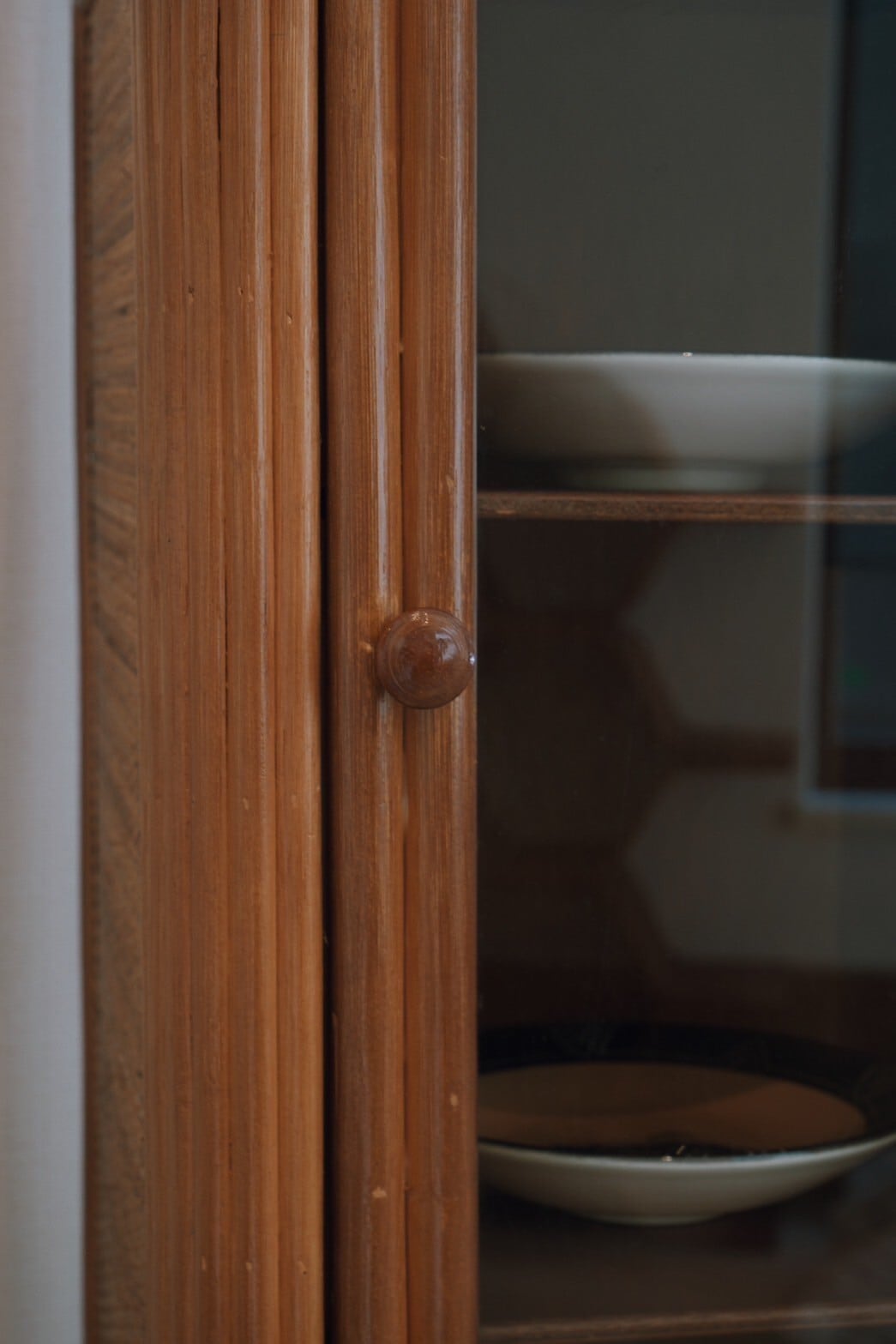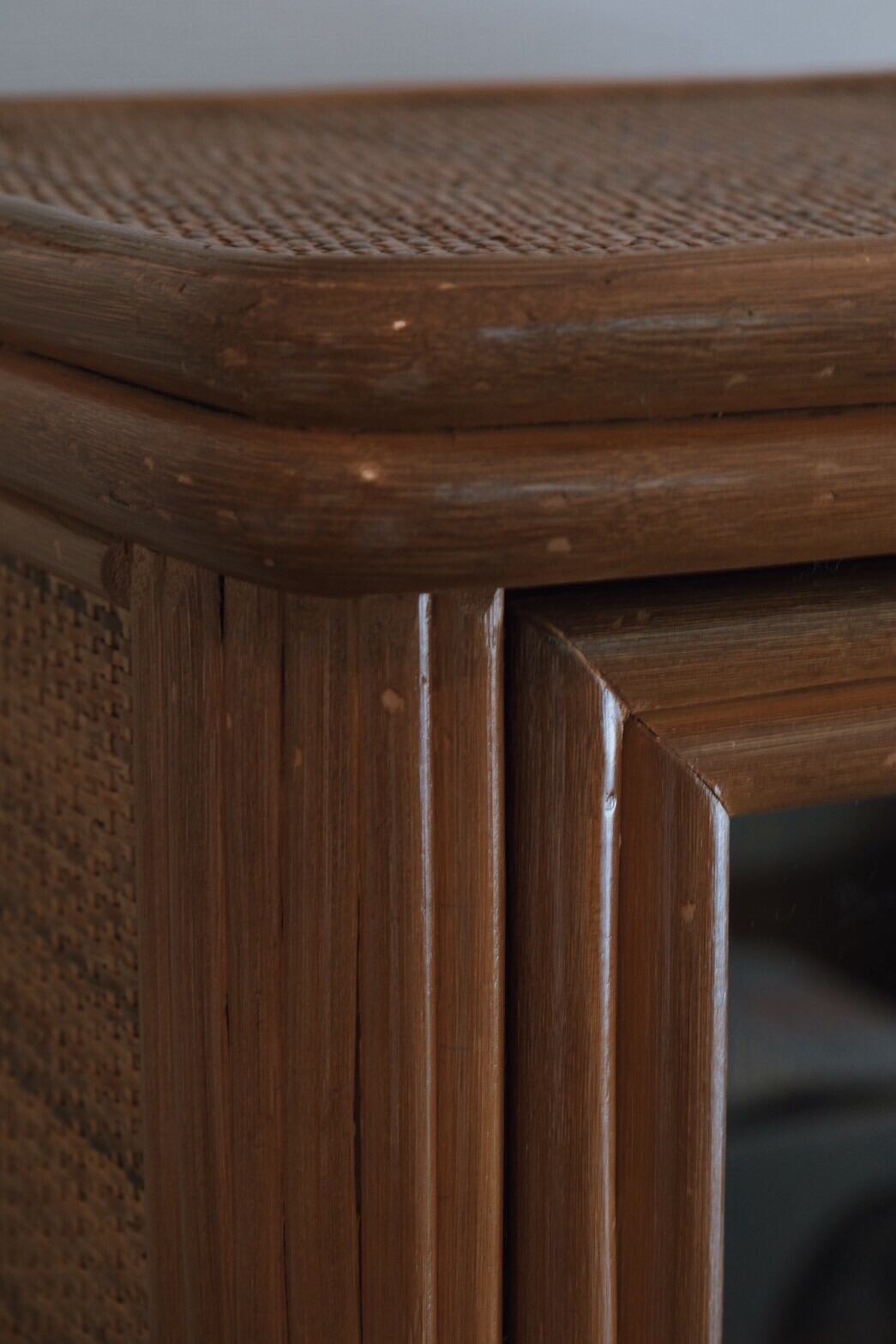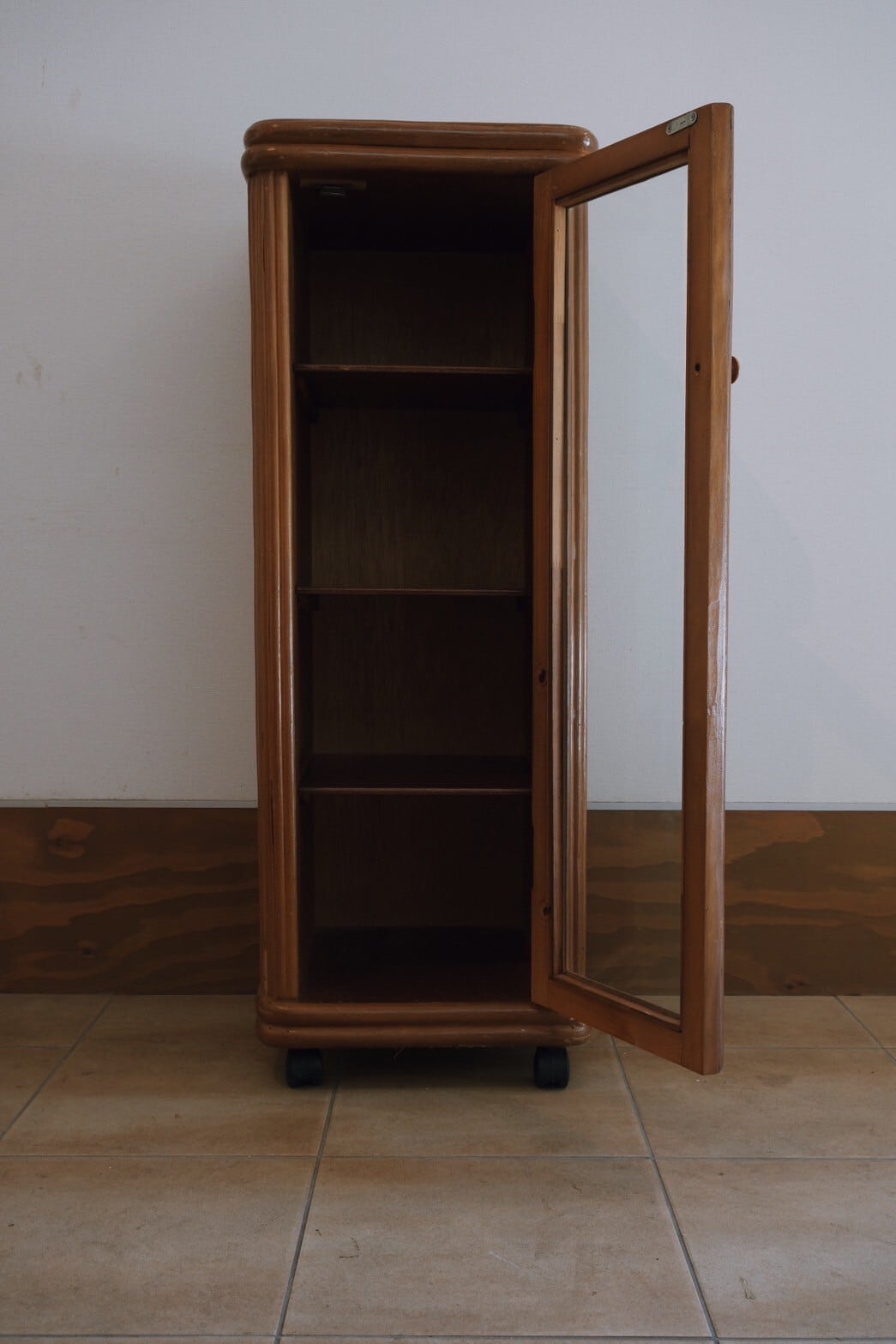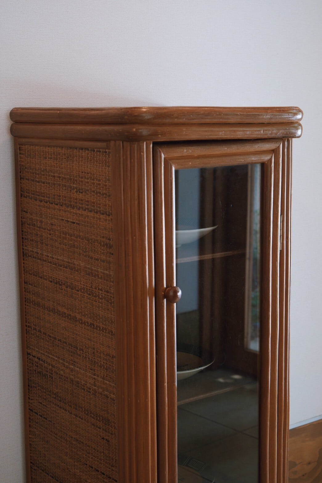 キャスター付きで動かしやすく、かっこよくもあるガラス戸のラタン収納棚が入荷!