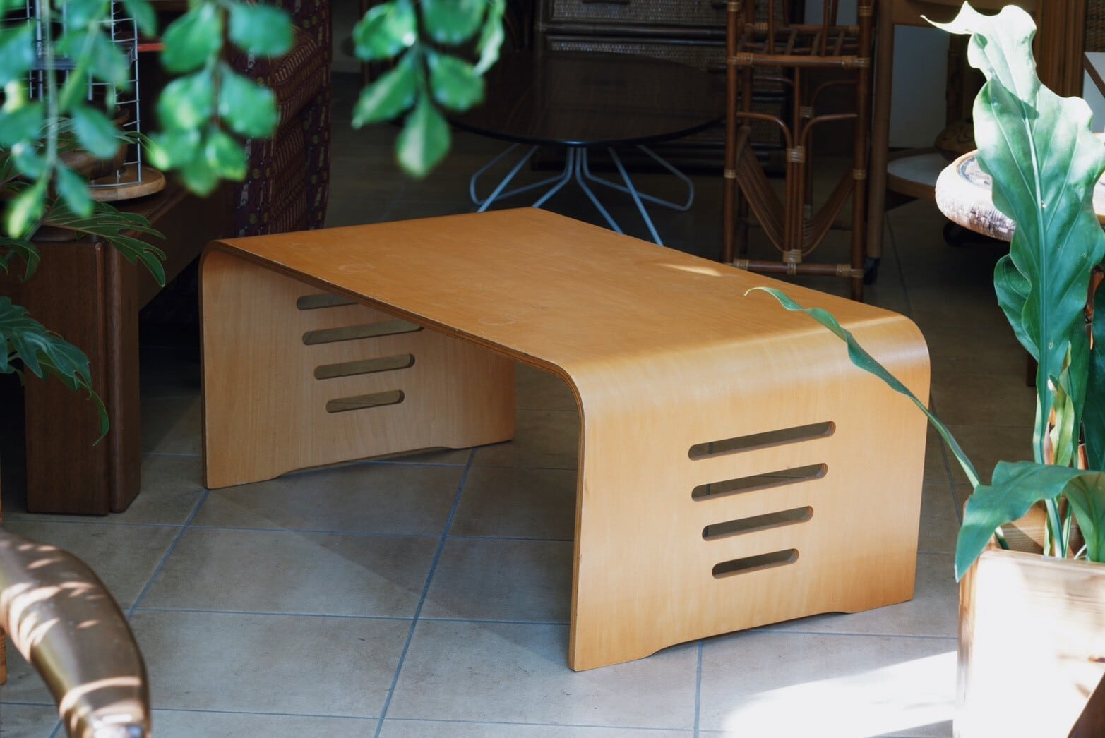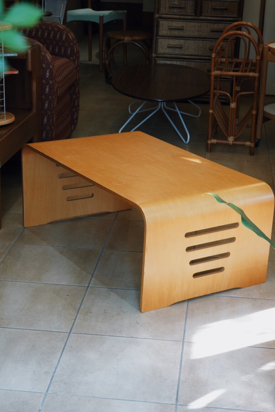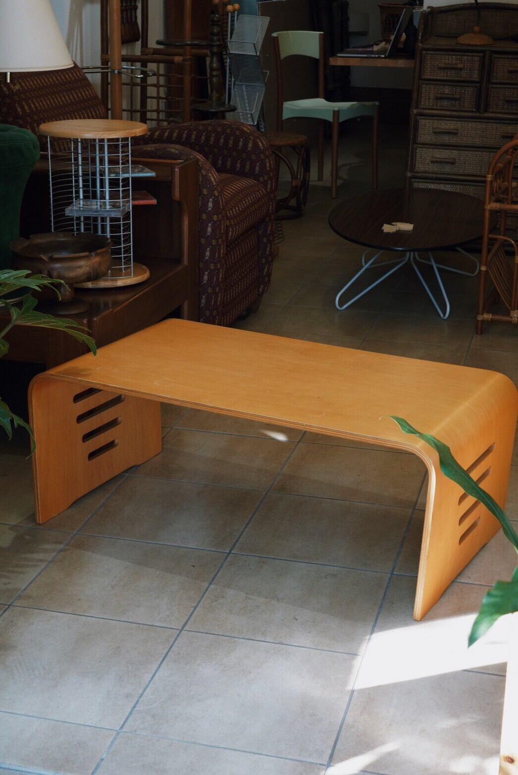 植物好きのお部屋に似合いそうな曲線がかわいいプライウッドのローテーブルを発見♪