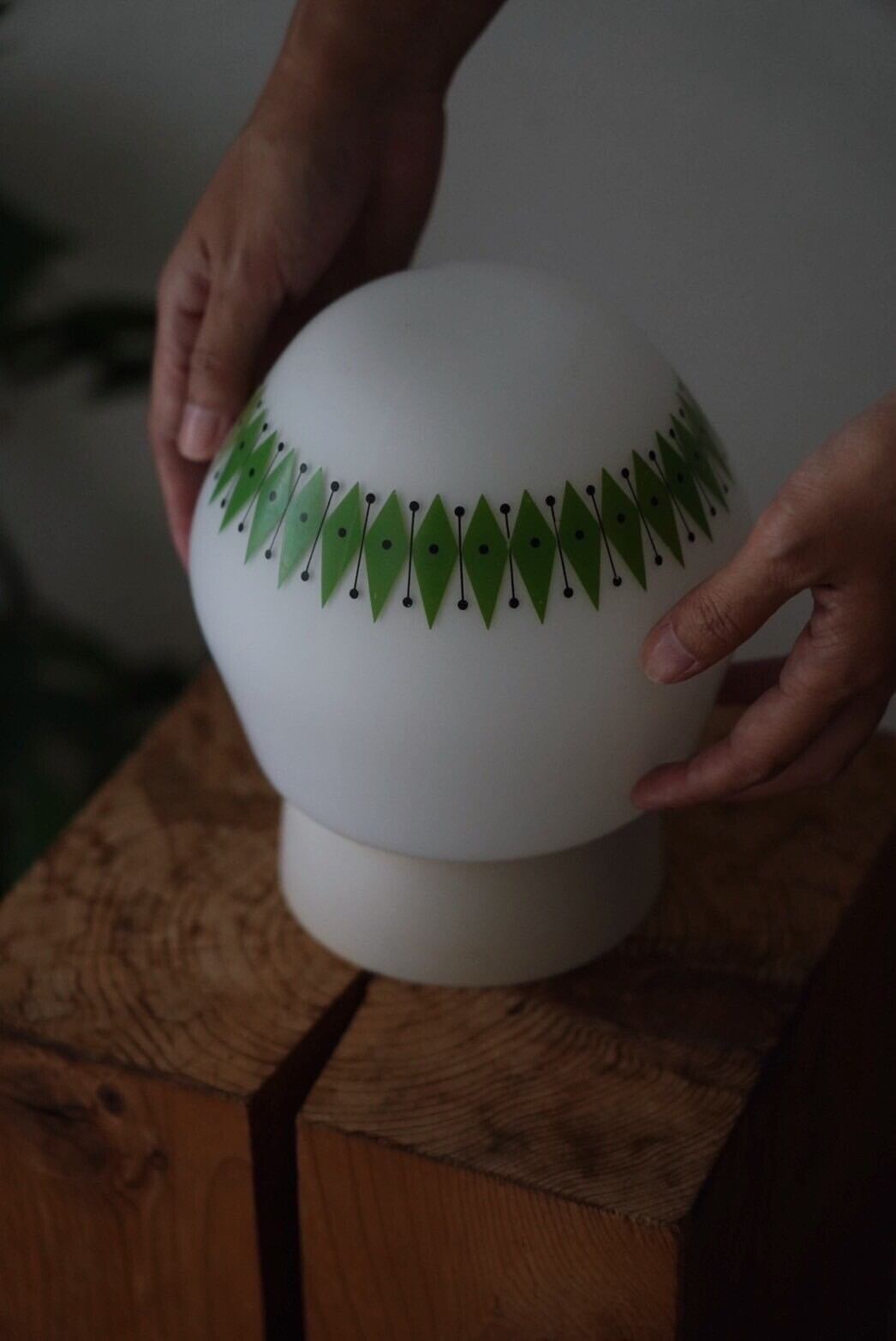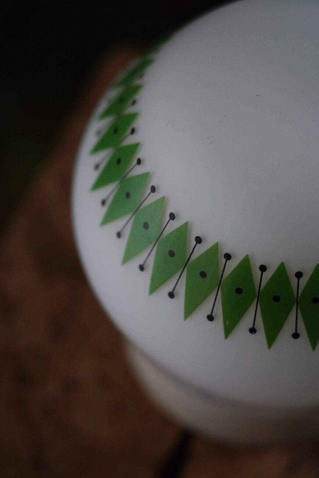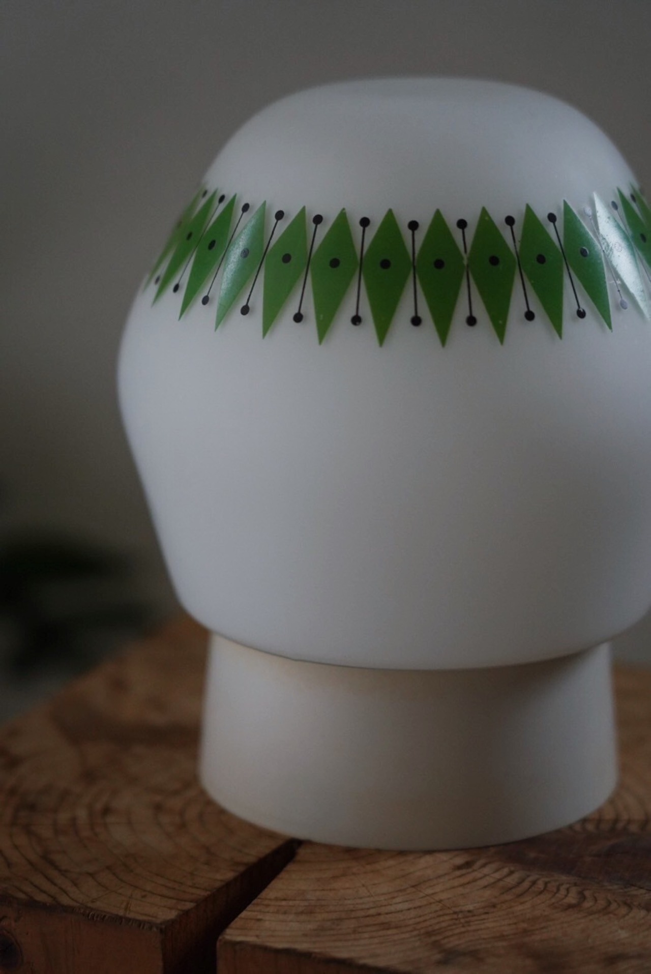 白ベースのシーリングランプにミルクガラスにキウイのようなアクセントが入ったガラスシェード。