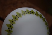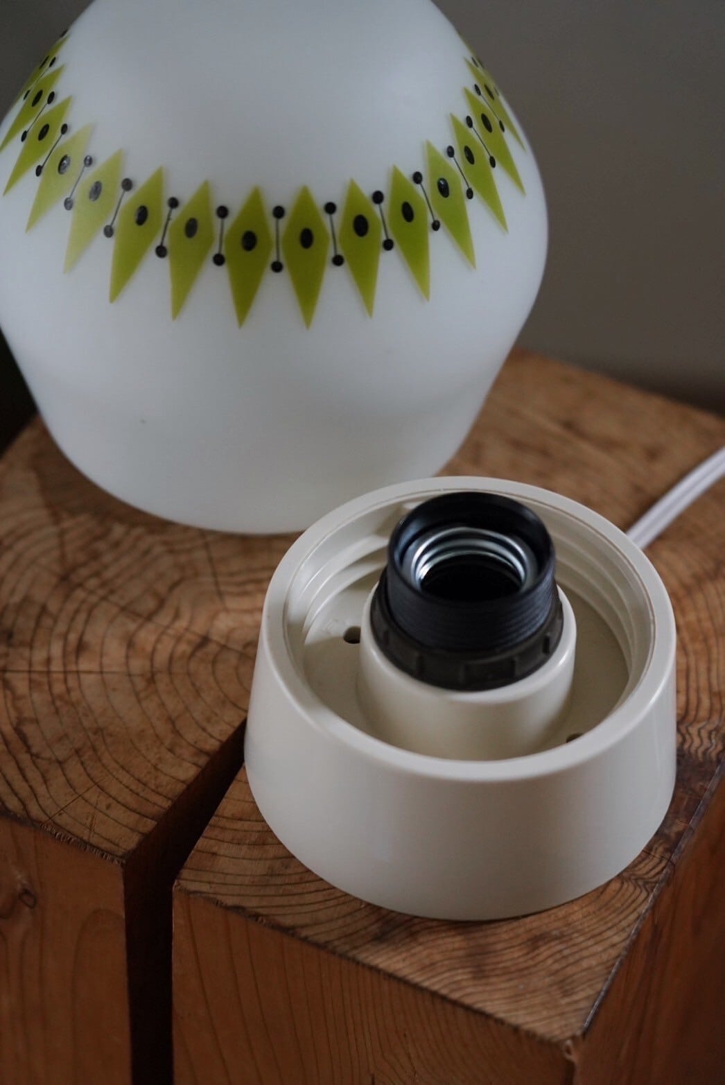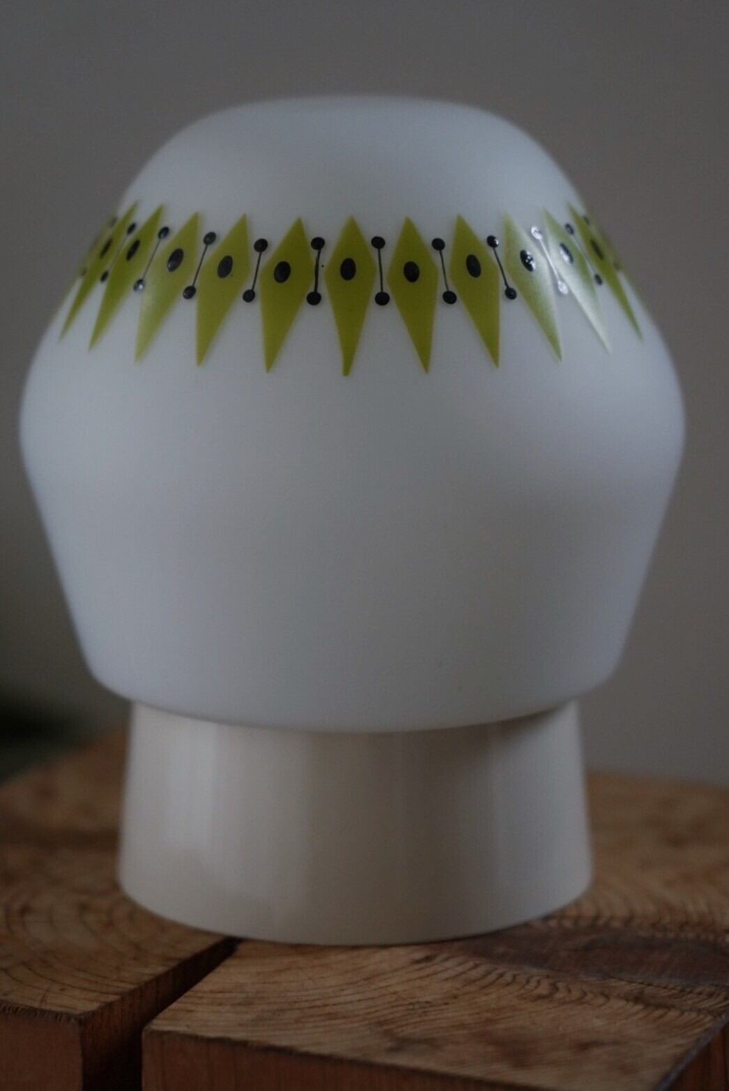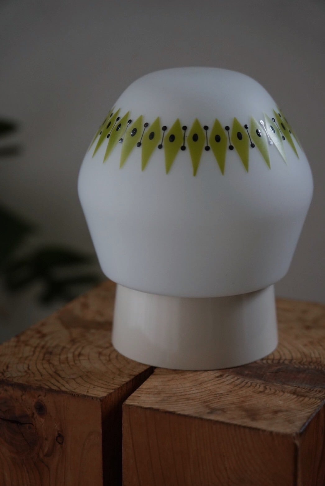 白ベースのシーリングランプにミルクガラスにアボカド色のようなアクセントが入ったガラスシェード。