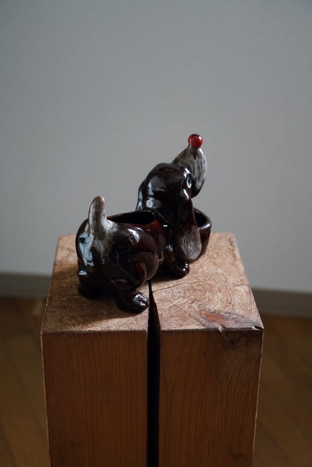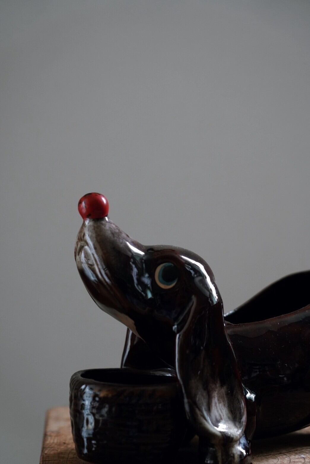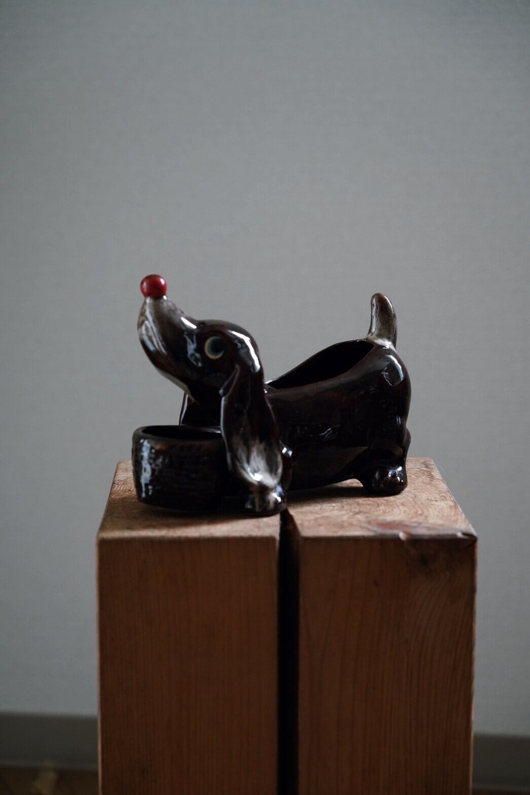 少し擦りむいたまっ赤なお鼻のダックスフンドのヴィンテージフラワースタンド